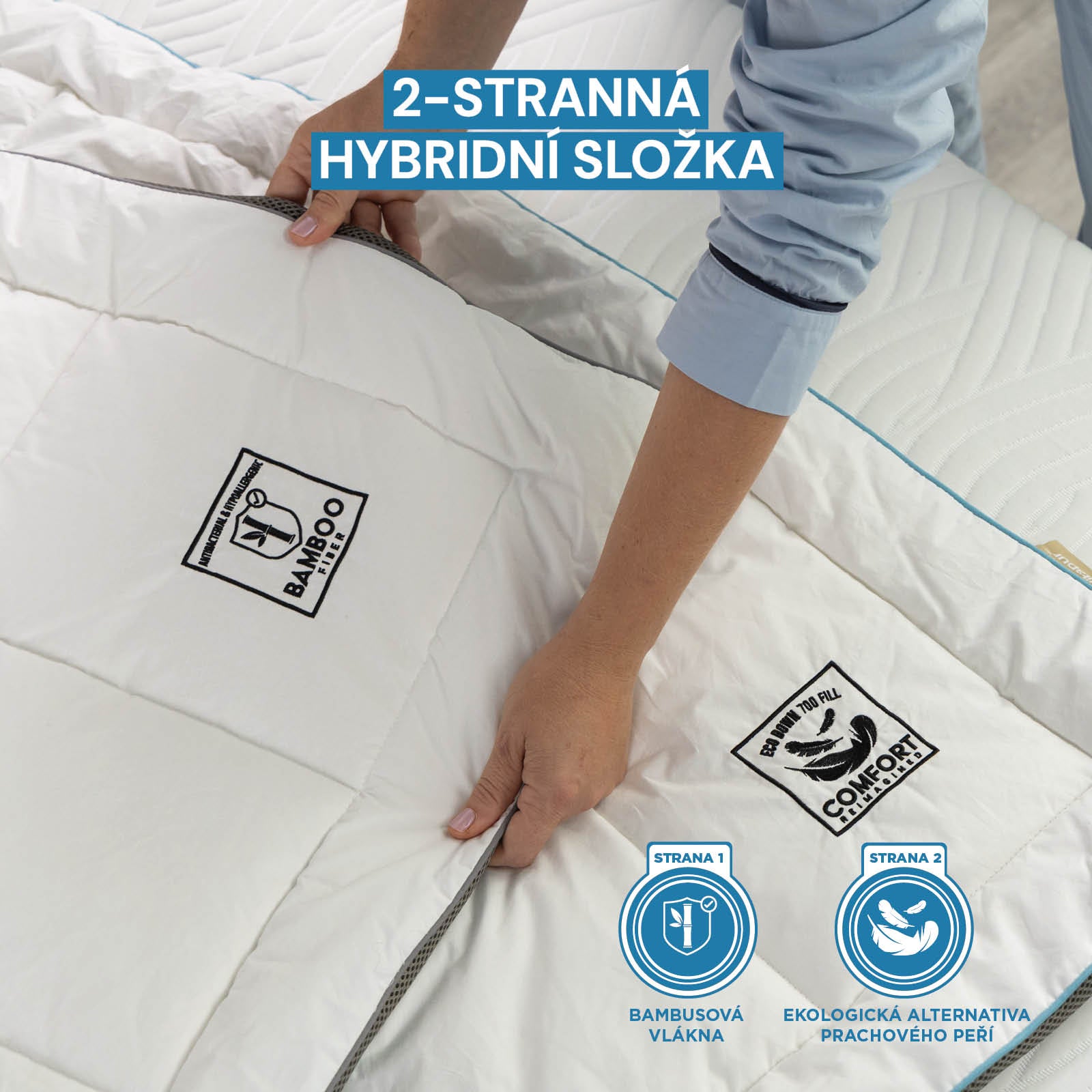 - Dvouvrstvé hybridní složení nabízí lepší pohodu v každém nočním objetí: vrstva bambusových vláken dokonale reguluje teplo a odvádí vlhkost, takže vám nikdy nebude příliš horko, zatímco vrstva speciálních mikrovláken, jako ekologická alternativa prachového peří, poskytuje luxusní pocit měkkosti a bohatého objemu.