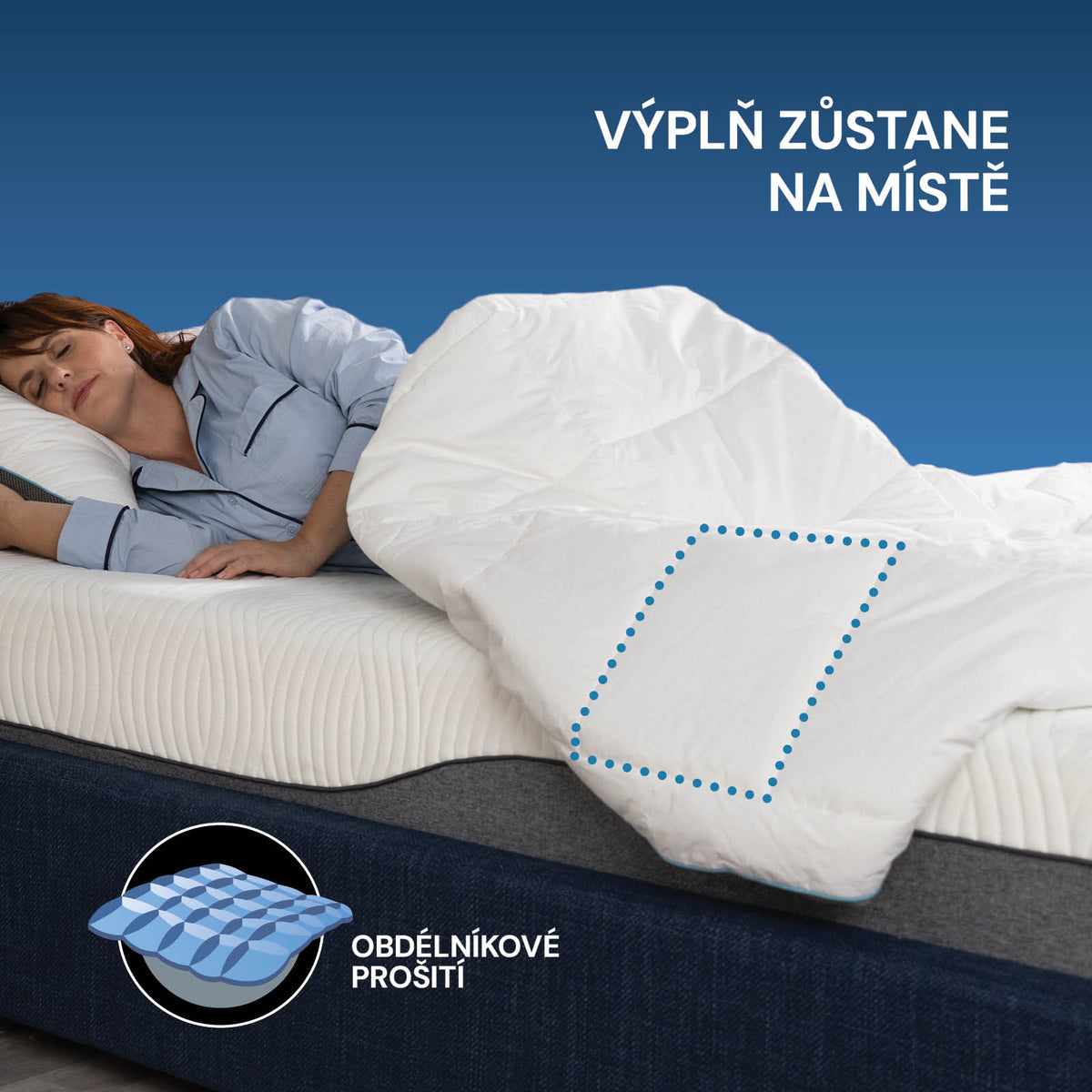 Čtvercové prošití zajišťuje rovnoměrné rozložení výplně a udržuje ji na místě, takže můžete zapomenout na přikrývky, kde je na jednom místě hrudka výplně a na jiném žádná. Čtvercové prošití funguje výjimečně dobře i po několikanásobném vyprání, protože usnadňuje přerozdělení a načechrání výplně. Ideální pro extra nadýchanost, takže budete spát jako na obláčku.