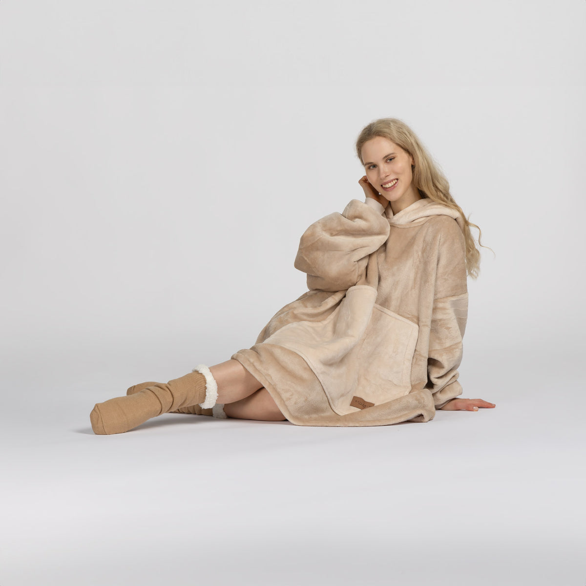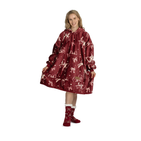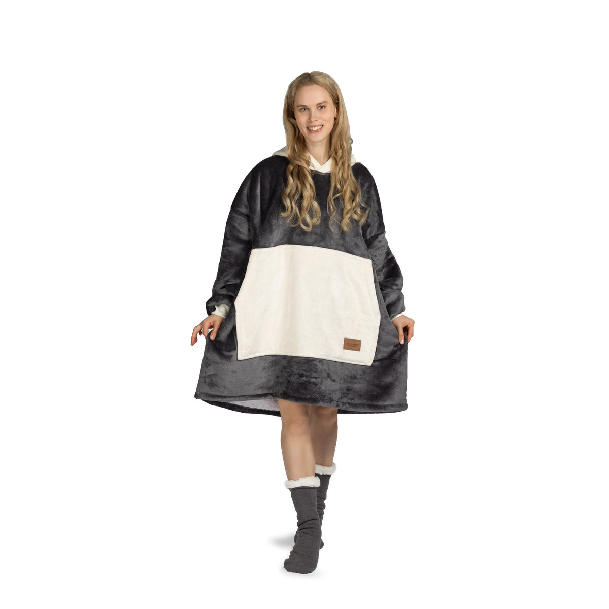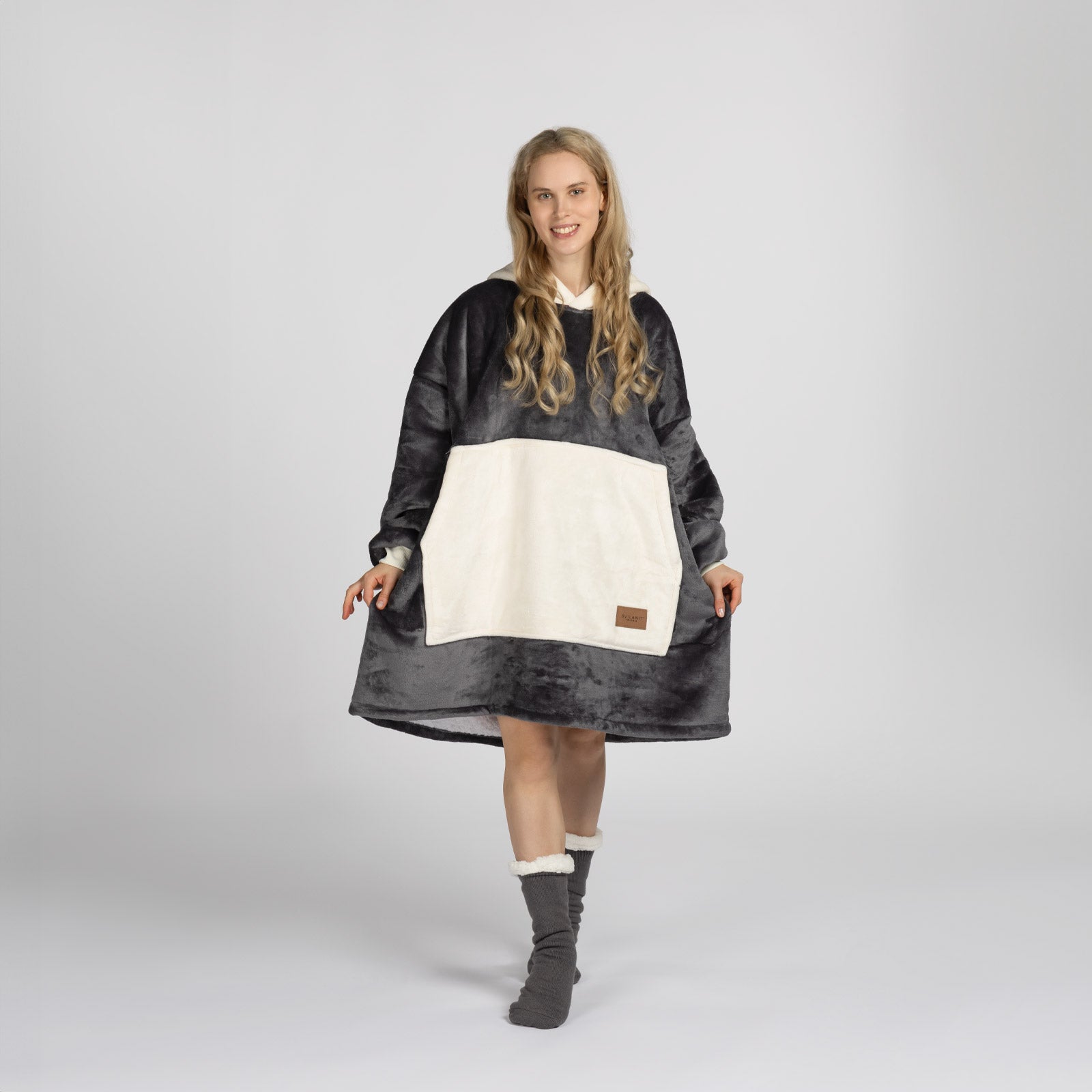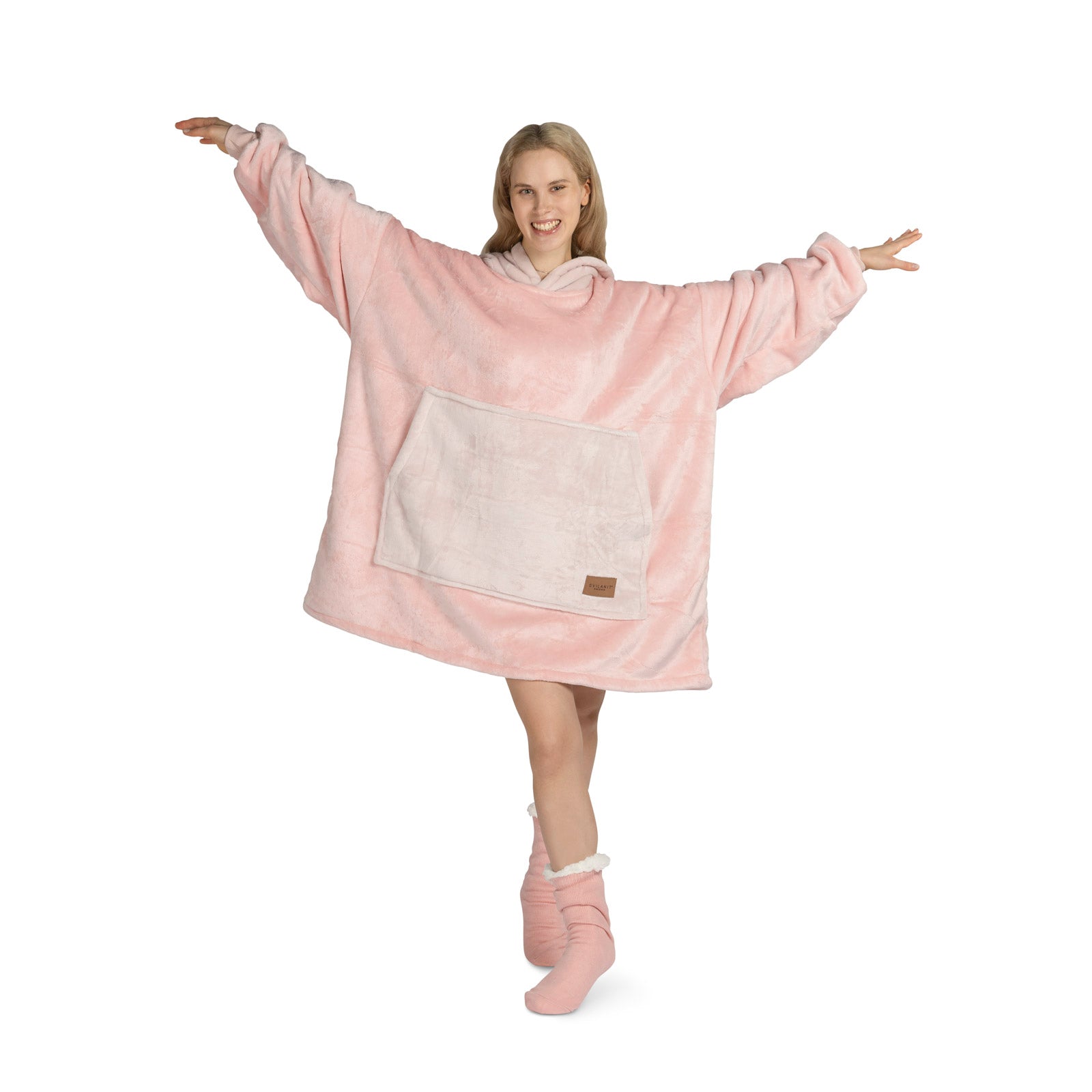 Vnitřní materiál sherpa dokonale udržuje teplo a zajišťuje pohodlí za všech okolností. Vnější plyšová tkanina je ještě jemnější na dotek a připravená k objetí. Deka s rukávy a kapucí je ideální také jako dárek pro ty, které máte nejraději.