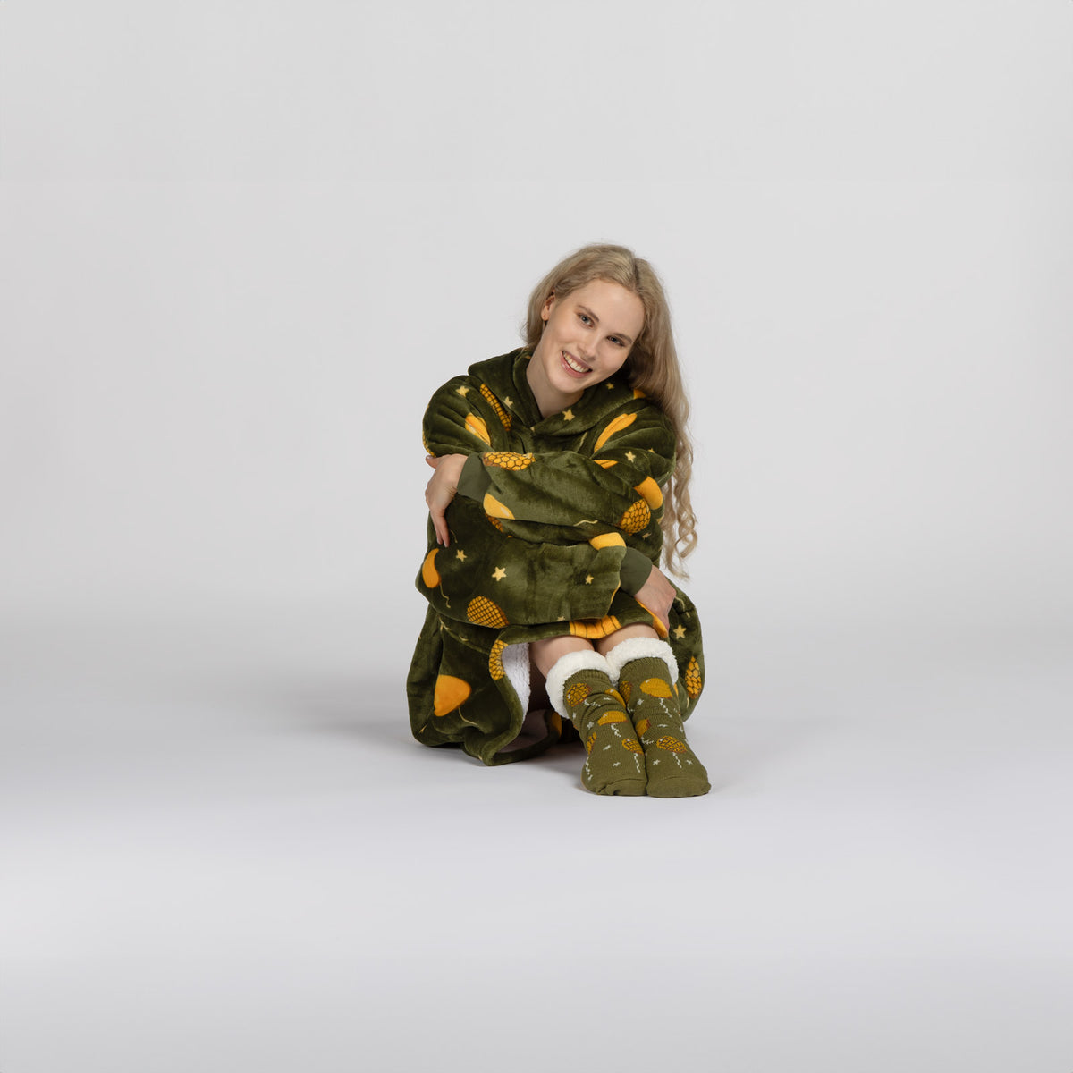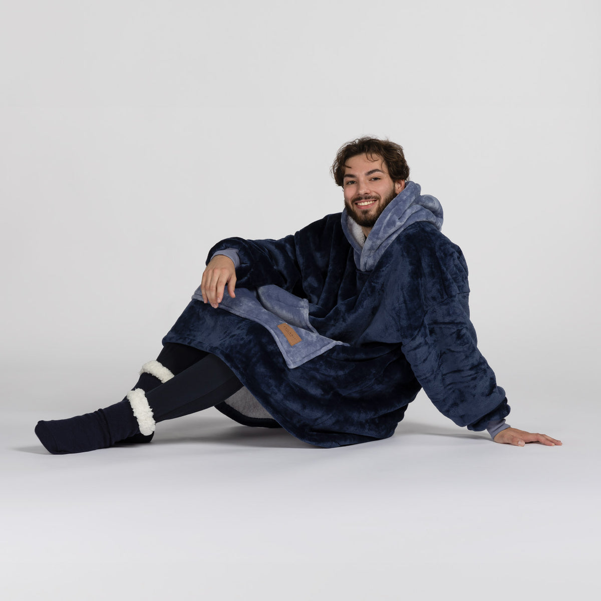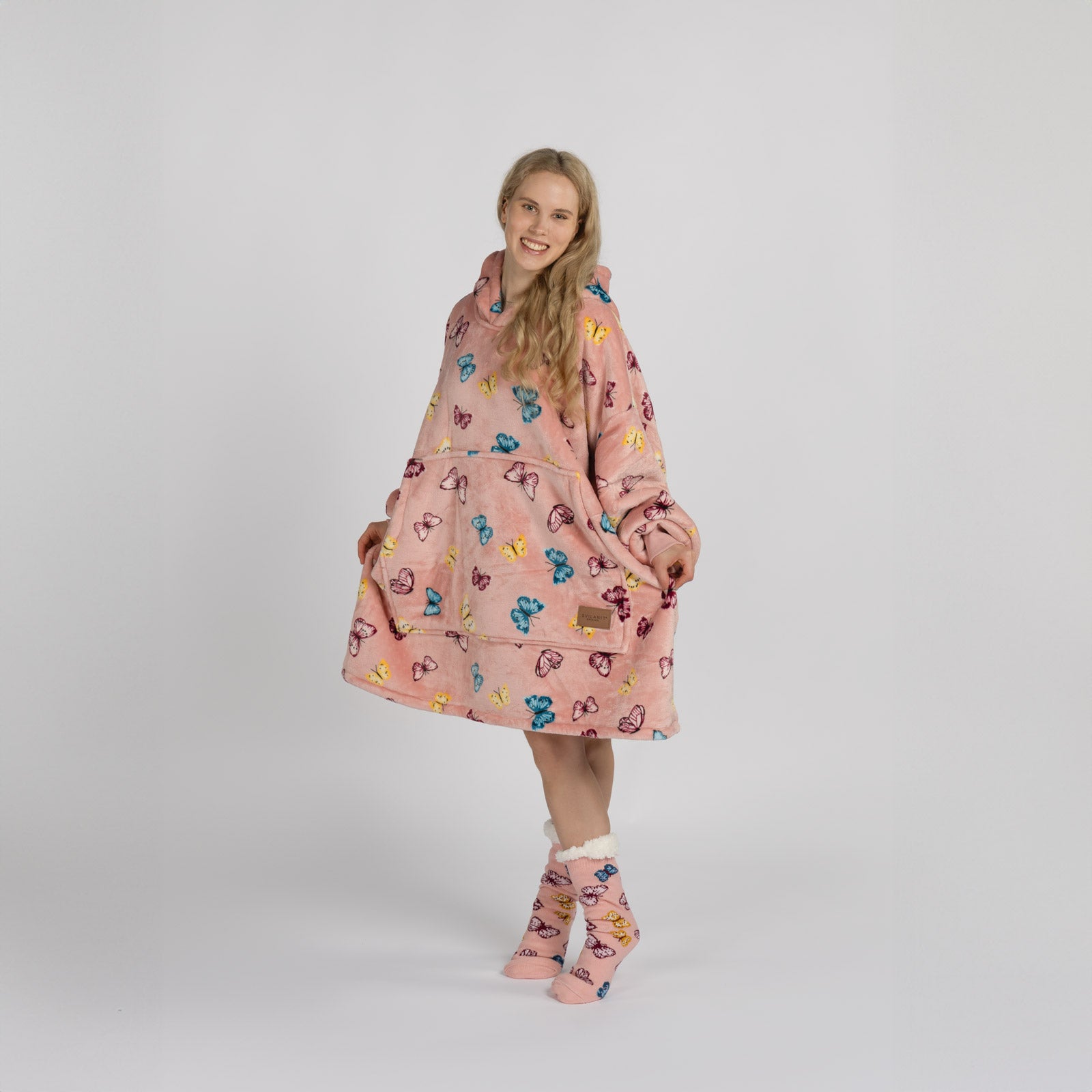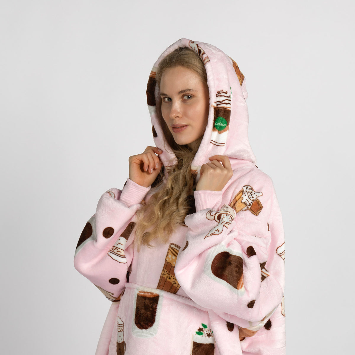 Vnitřní materiál sherpa dokonale udržuje teplo a zajišťuje pohodlí za všech okolností. Vnější plyšová tkanina je ještě jemnější na dotek a připravená k objetí. Deka s rukávy a kapucí je ideální také jako dárek pro ty, které máte nejraději.