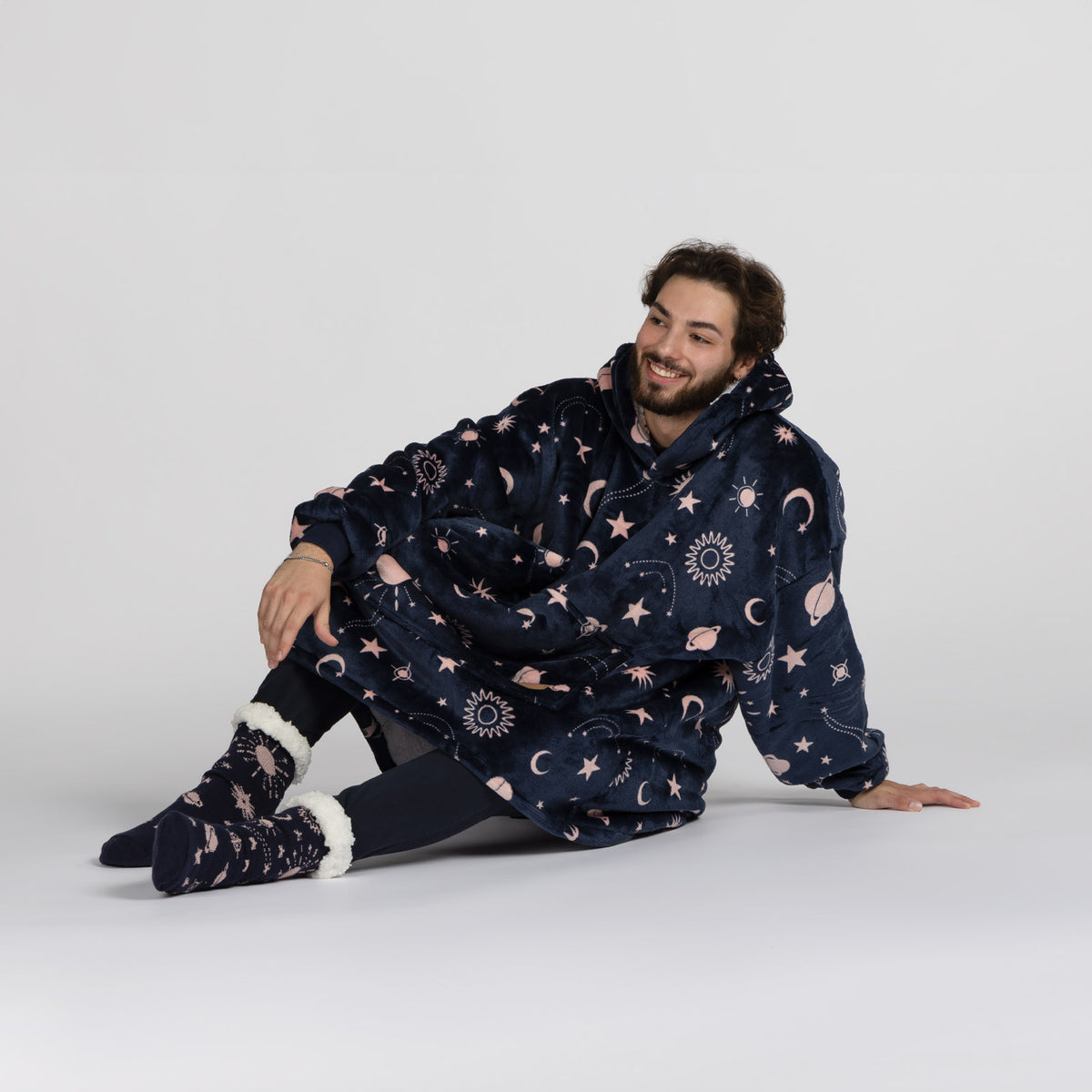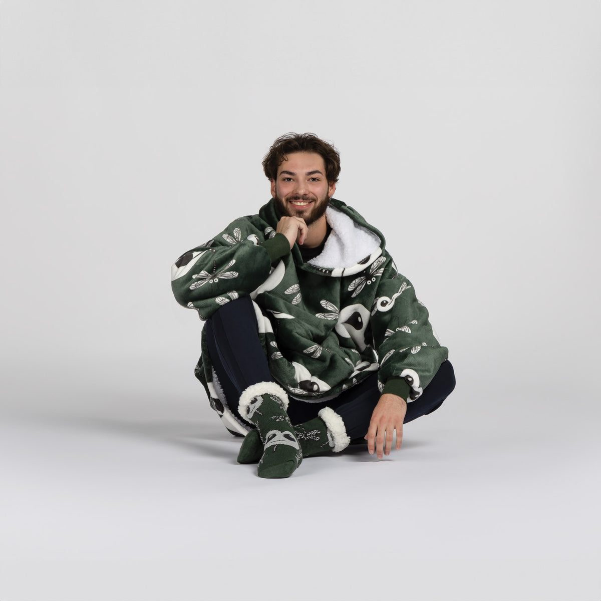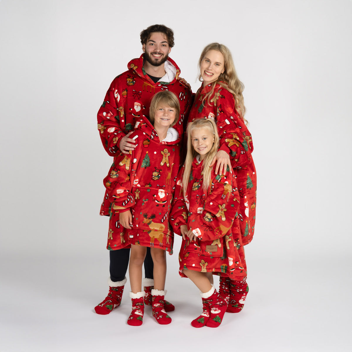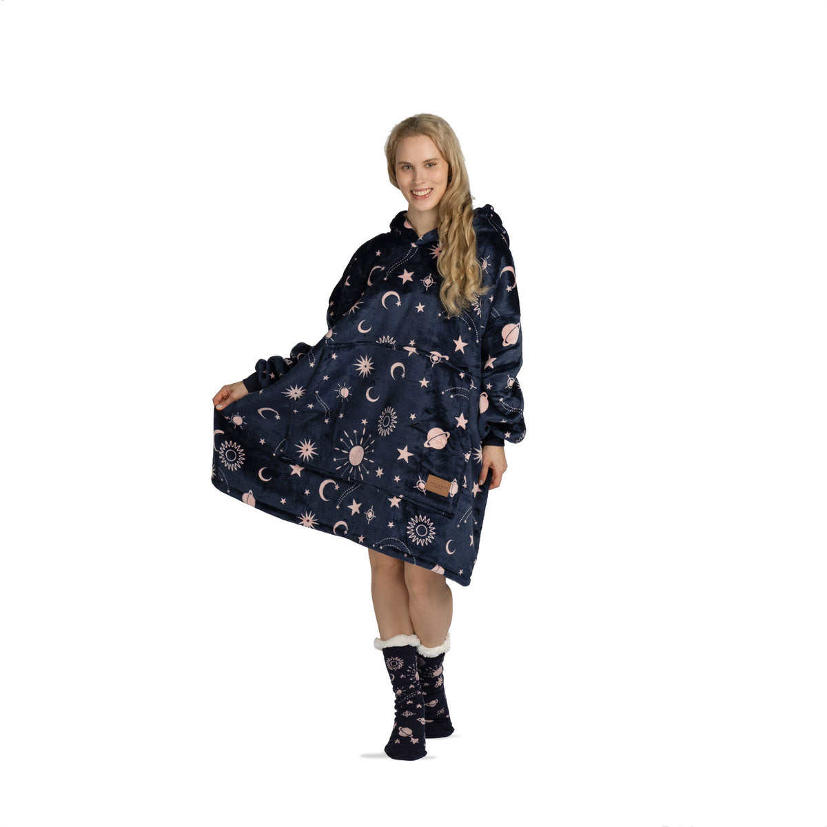 Vnitřní materiál sherpa dokonale udržuje teplo a zajišťuje pohodlí za všech okolností. Vnější plyšová tkanina je ještě jemnější na dotek a připravená k objetí. Deka s rukávy a kapucí je ideální také jako dárek pro ty, které máte nejraději.