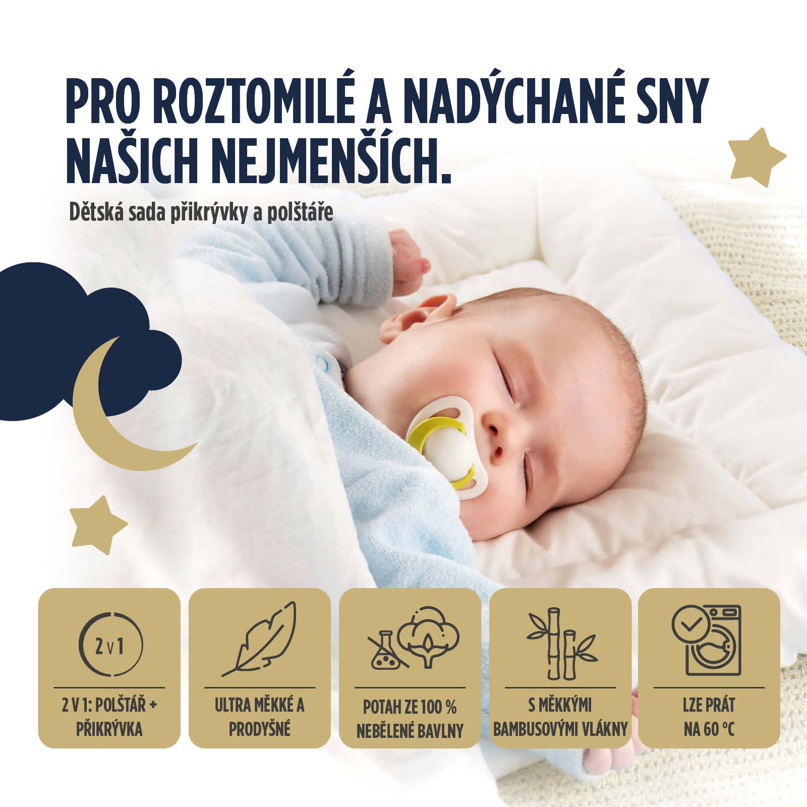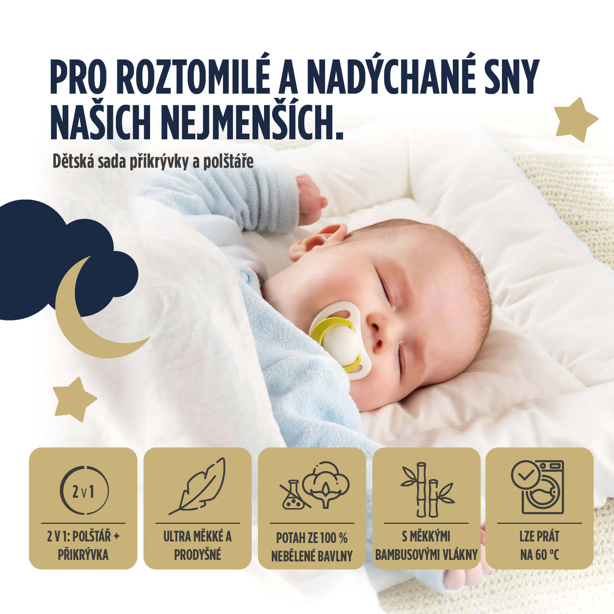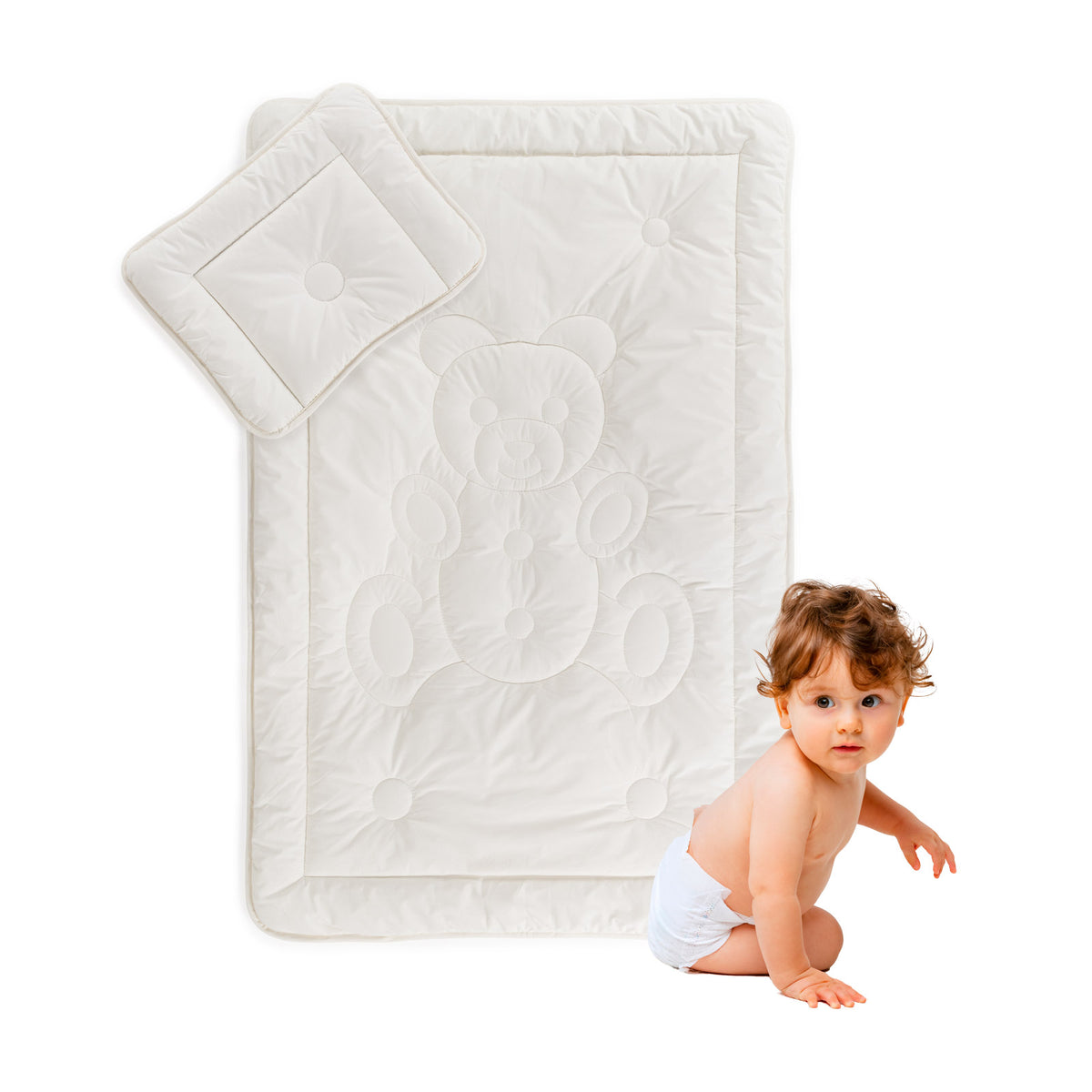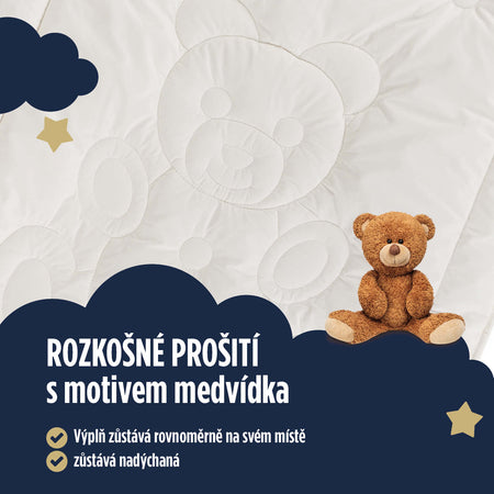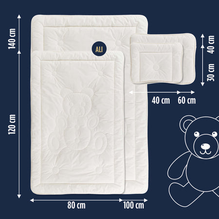Děti potřebují nižší polštář a vzdušnou přikrývku, protože se během spánku často potí a v důsledku toho se budí. Polštář díky své výšce a tvaru nabízí dokonalou oporu pro hlavu dítěte, je nízký a měkký, a přispívá tak ke sladkému spánku. Měkká přikrývka jemně kolébá tělo pro klidnější noci.