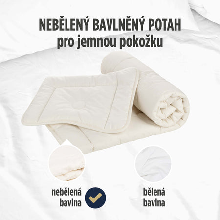 - Potah je vyroben z nebělené bavlny, která je ve srovnání s tradičními bavlněnými látkami šetrnější a zcela nezávadná.