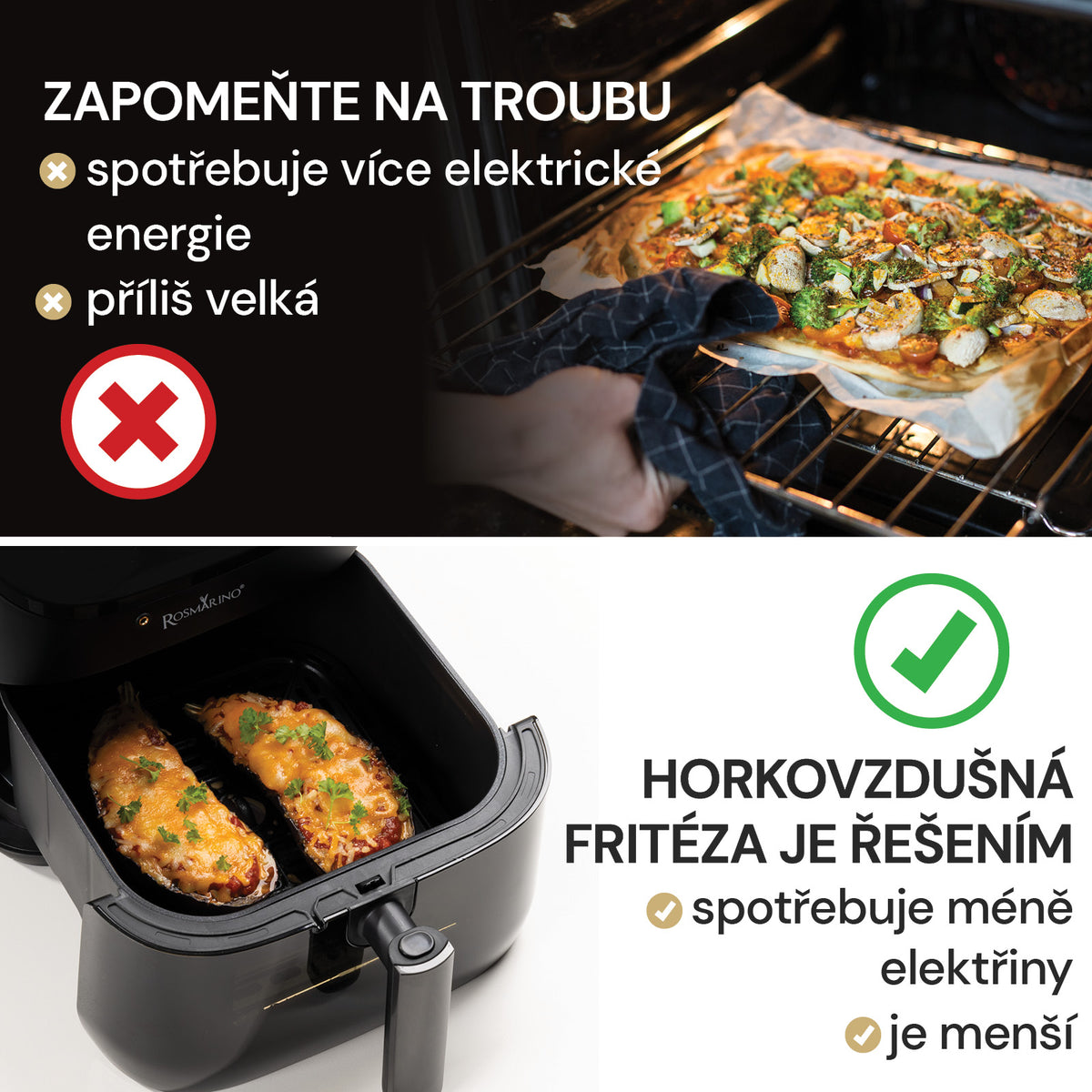Horkovzdušná technologie umožňuje používat minimum oleje při zachování křupavosti a lahodné chuti pokrmů. Horký vzduch cirkuluje kolem pokrmu a ohřívá jej ze všech stran, čímž zajišťuje rovnoměrné propečení. Pokrmy jsou na povrchu křupavé a uvnitř měkké. Výhodou oproti troubě je, že vaše kuchyně nebude plná nepříjemných pachů z vaření.