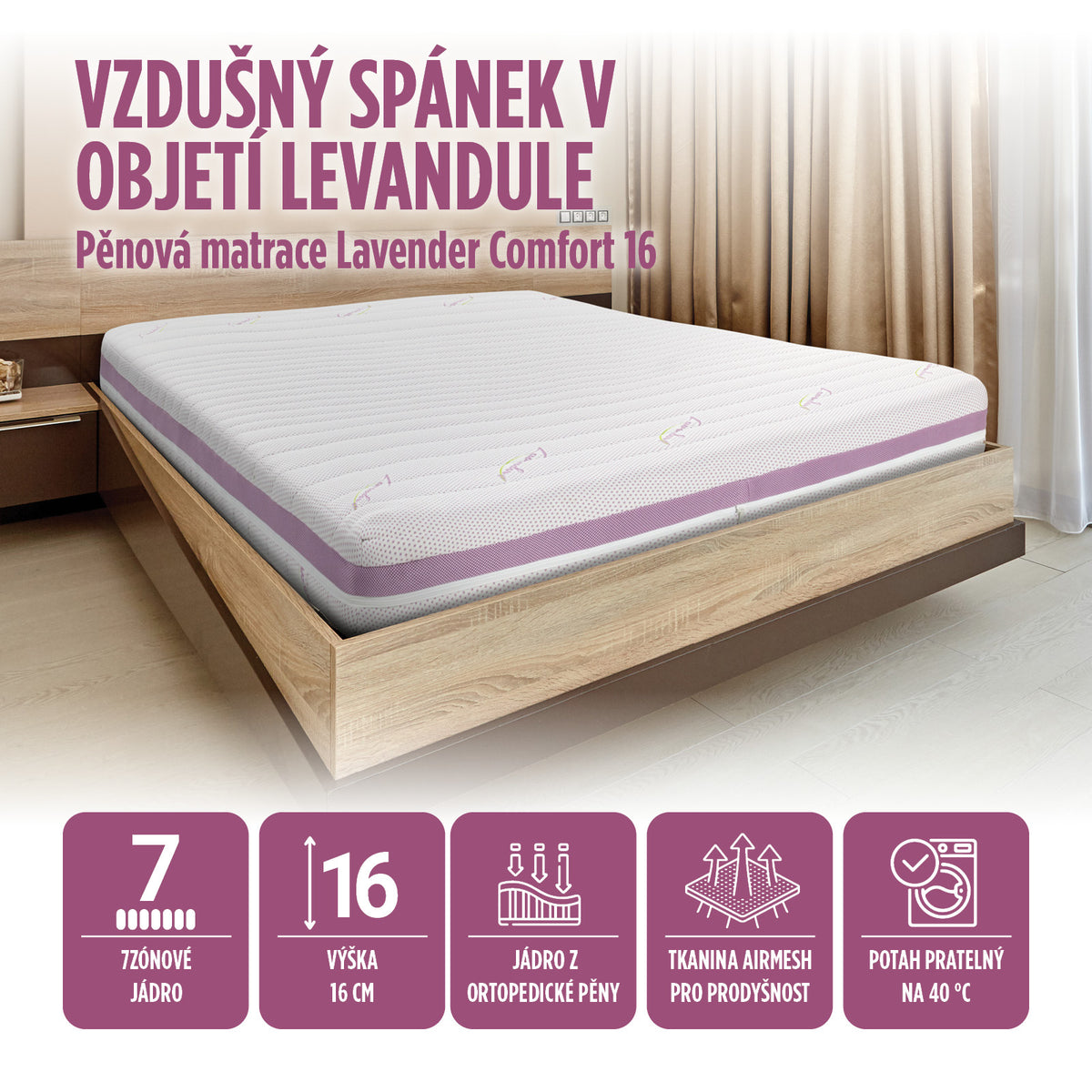 Matrace Lavender Comfort 16 je ideální pro každého, kdo má hmotnost do 75 kg a chce se probouzet svěží, odpočatý a plný energie. Dopřejte si univerzální pěnovou matraci, která vás zaujme svou všestranností, prodyšností a skutečně snadnou údržbou.