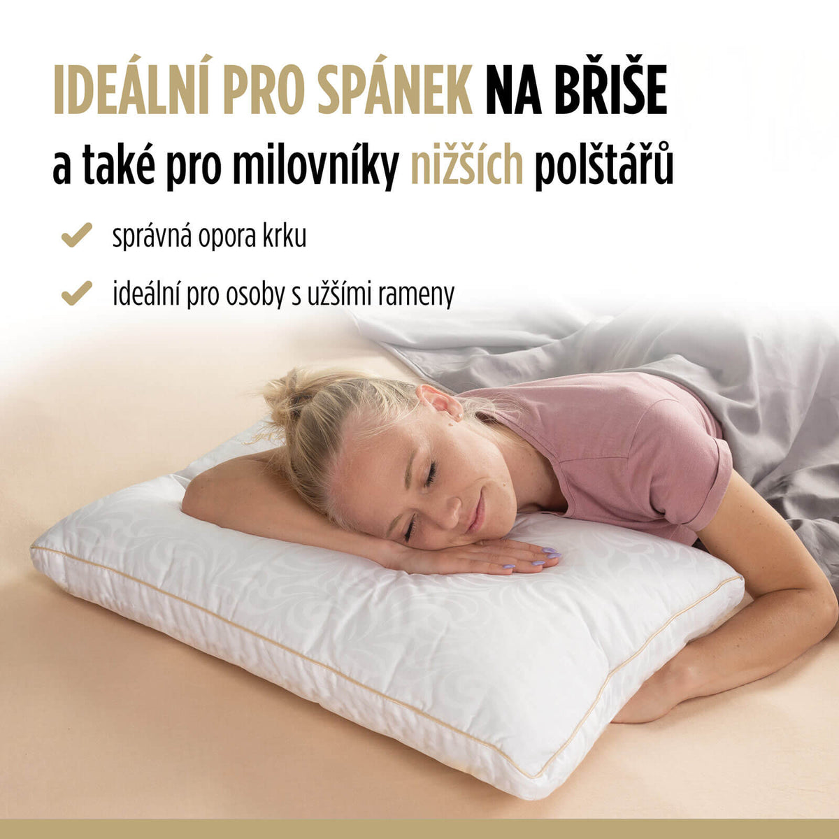 - Klasický nižší polštář, ideální pro spaní na břiše.