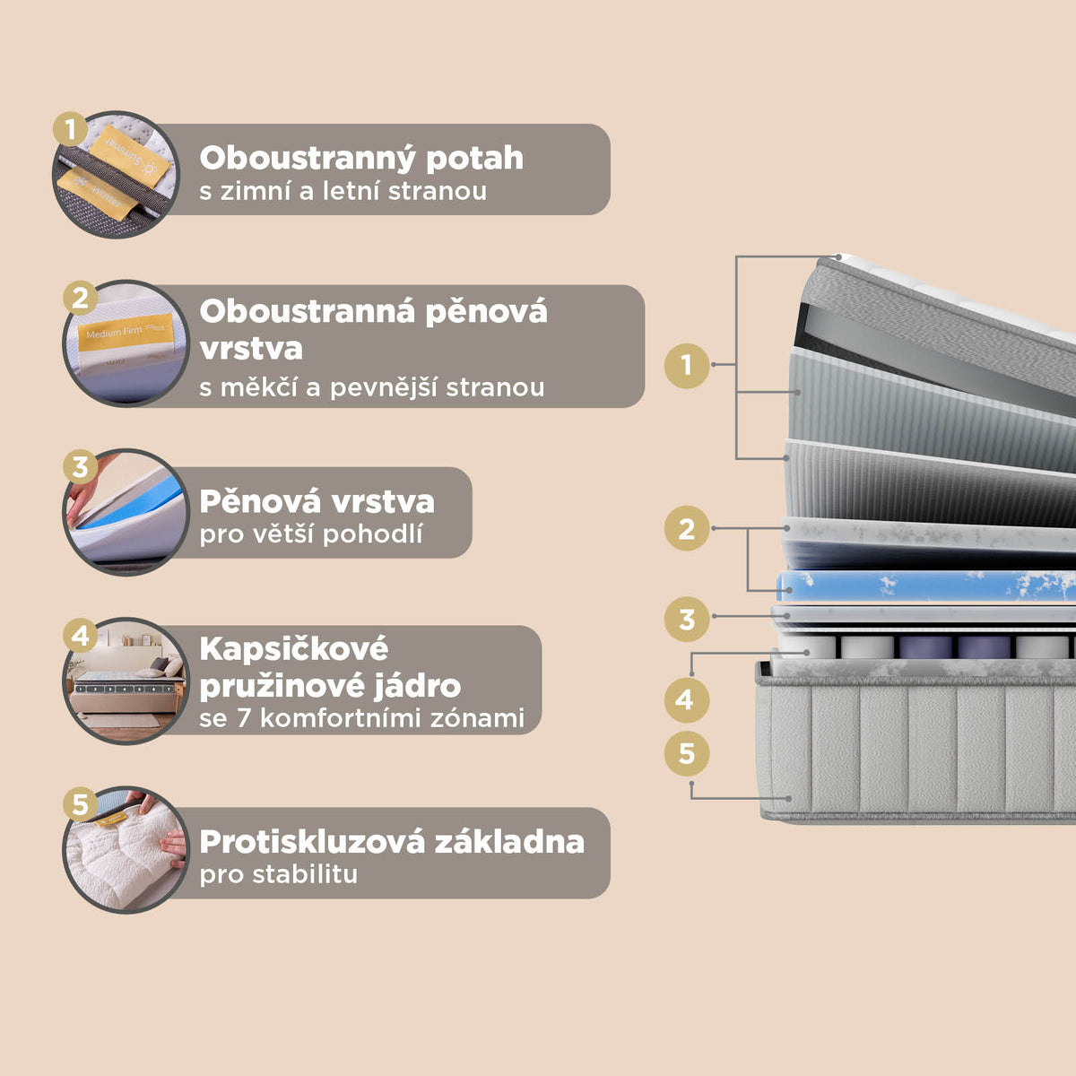 - Odnímatelná sezónní textilní tvrchní matrace se zimní a letní stranou reguluje teplotu a zajišťuje příjemné prostředí pro spánek po celý rok.