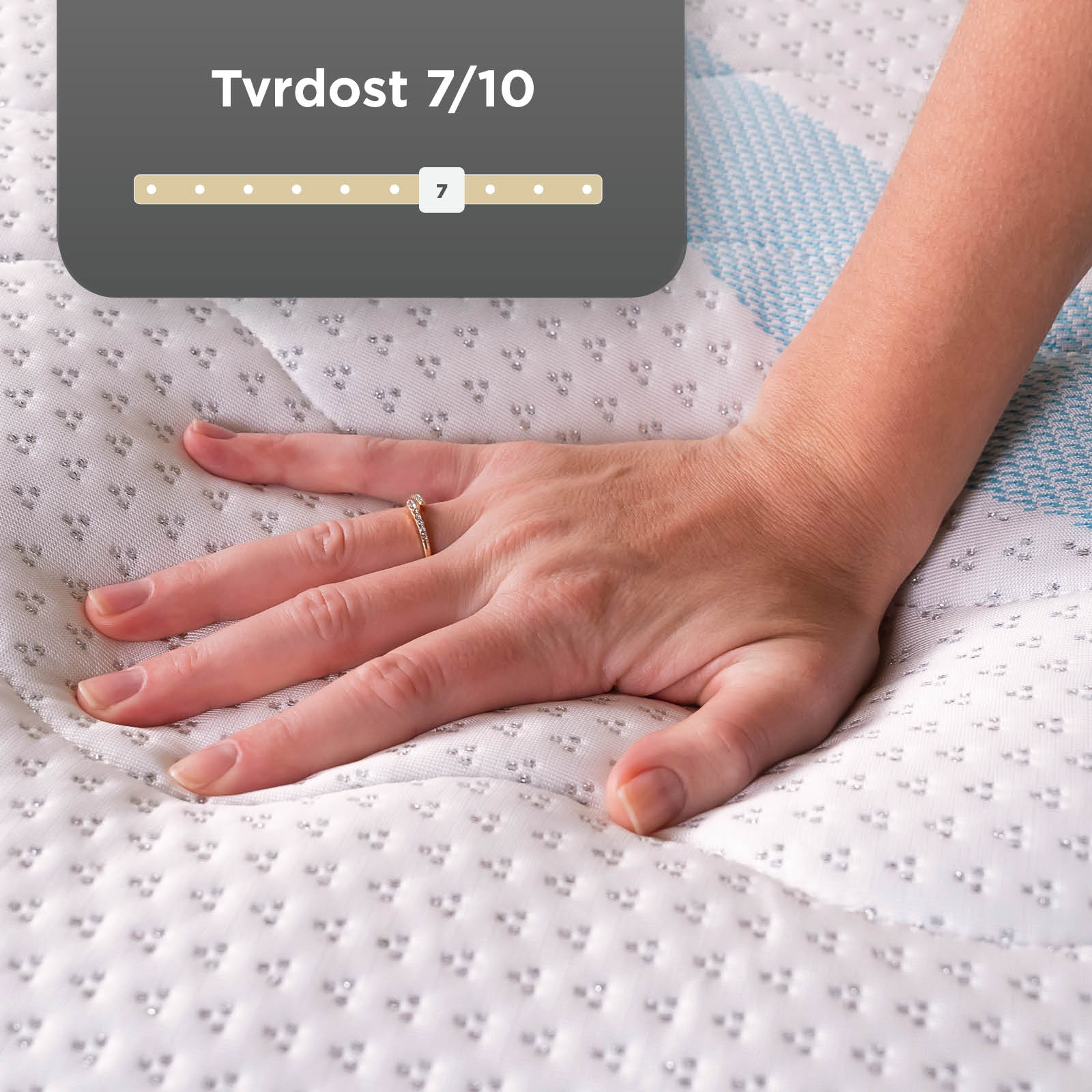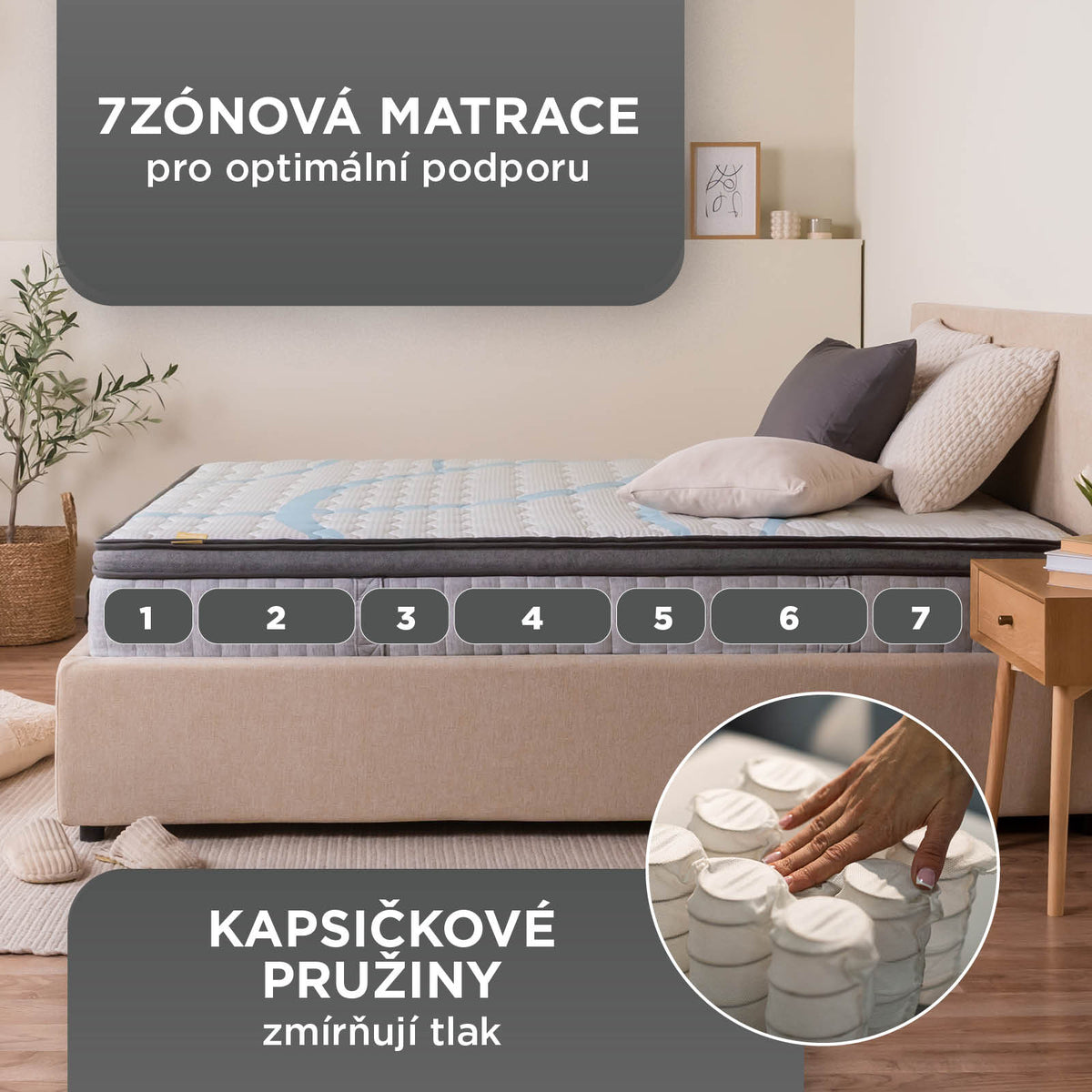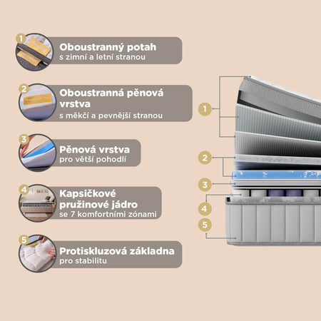 - 7zónové jádro z kapsičkových pružin poskytuje cílenou podporu a úlevu od tlaku po celé délce těla, čímž zlepšuje kvalitu spánku.