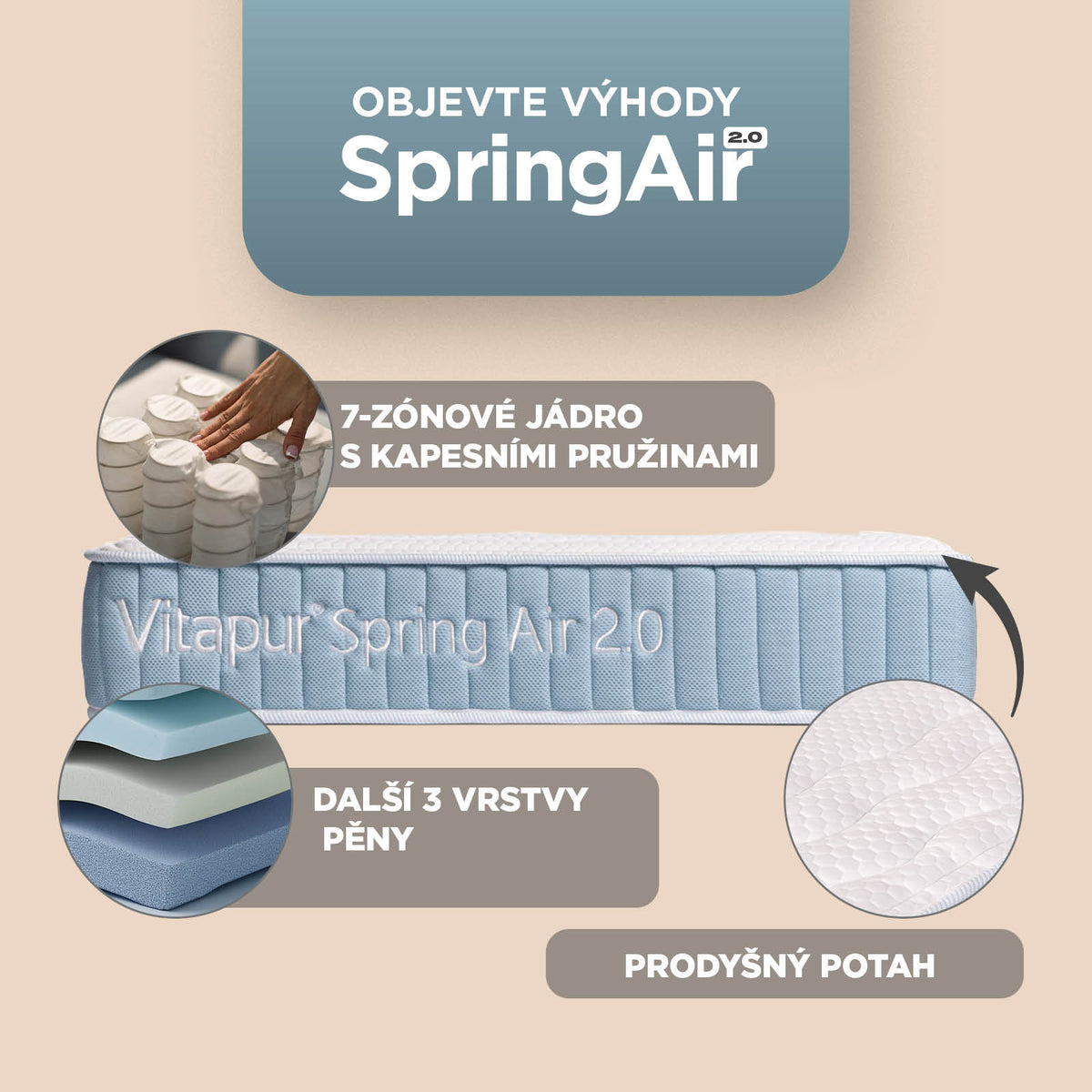 Matrace SpringAir 2.0 je ideální jako první matrace pro dítě, kvalitní matrace do studentského pokoje nebo jako hosťovská postel na chalupě. Potah z odolné textilie a protiskluzová spodní část zajišťují stabilitu matrace na jakémkoli povrchu.