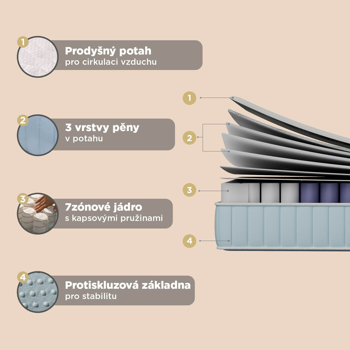 - 3 vrstvy pěny v potahu vytvářejí příjemně měkký povrch ke spánku.