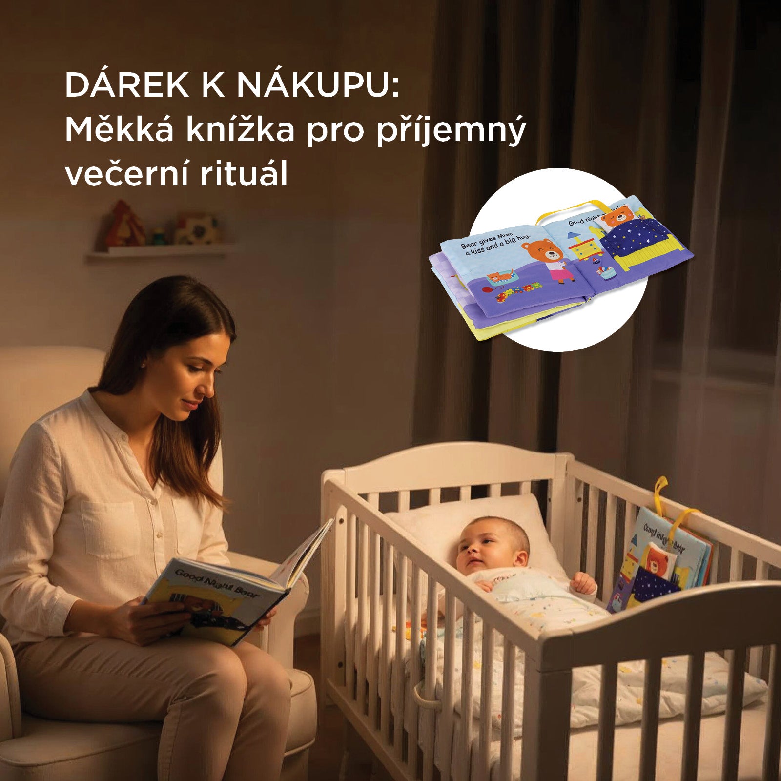 Přiložená měkká knížka „Good Night Bear“ pomáhá vytvořit klidný přechod ke spánku. Společné čtení pomáhá dítěti zklidnit se, cítit se v bezpečí a ospale, zatímco s ním sdílíte ten vzácný moment blízkosti, který se každý večer stává Vaším malým rituálem.