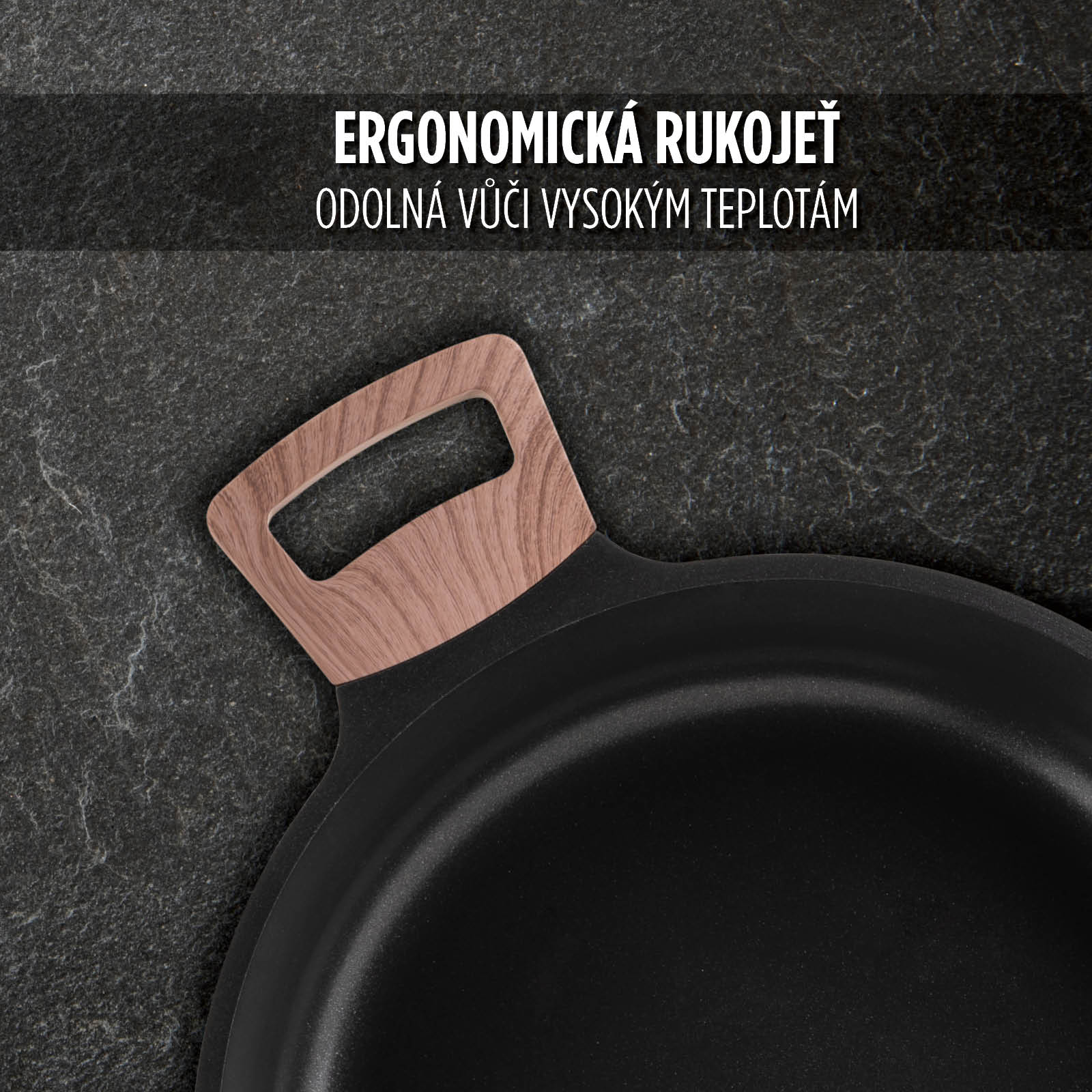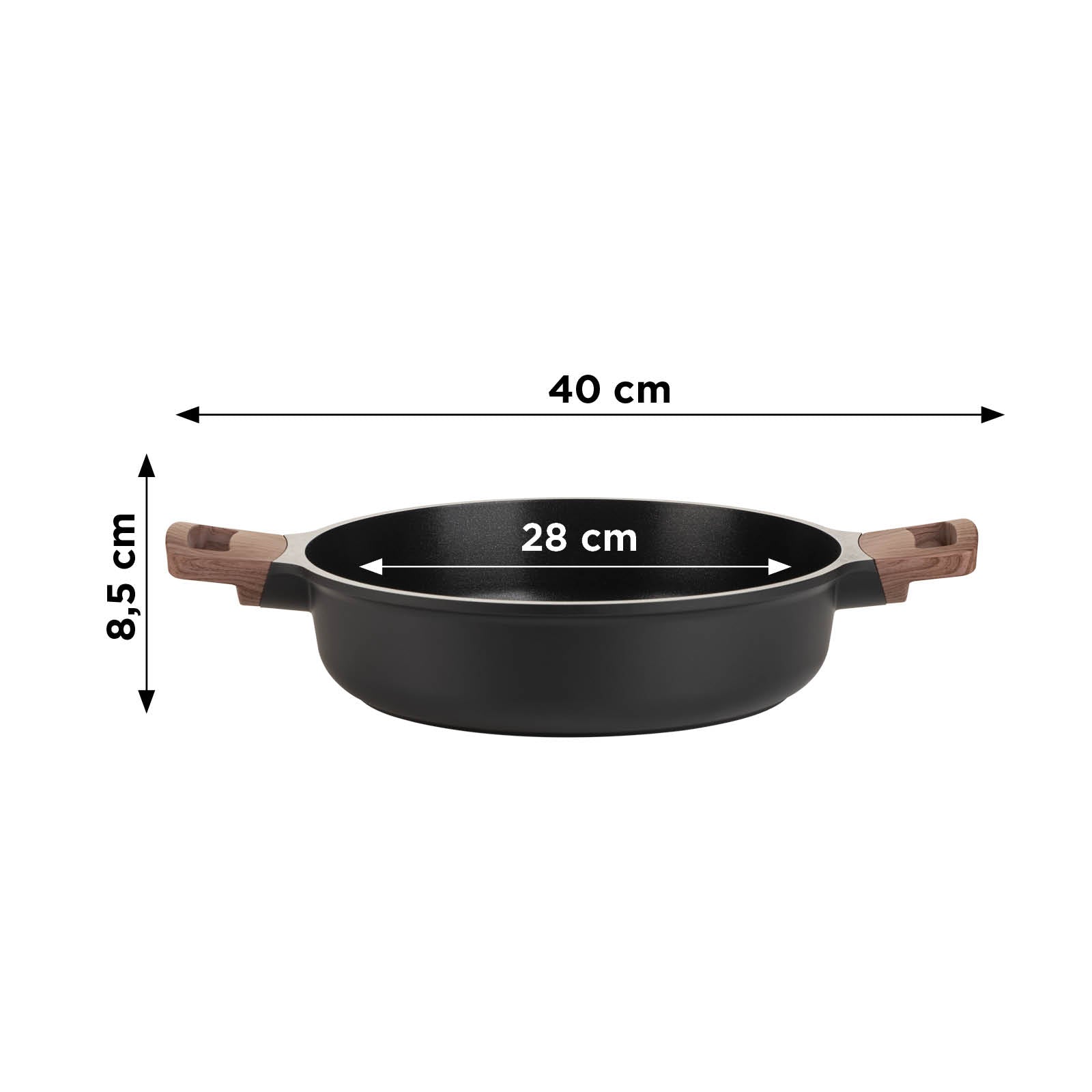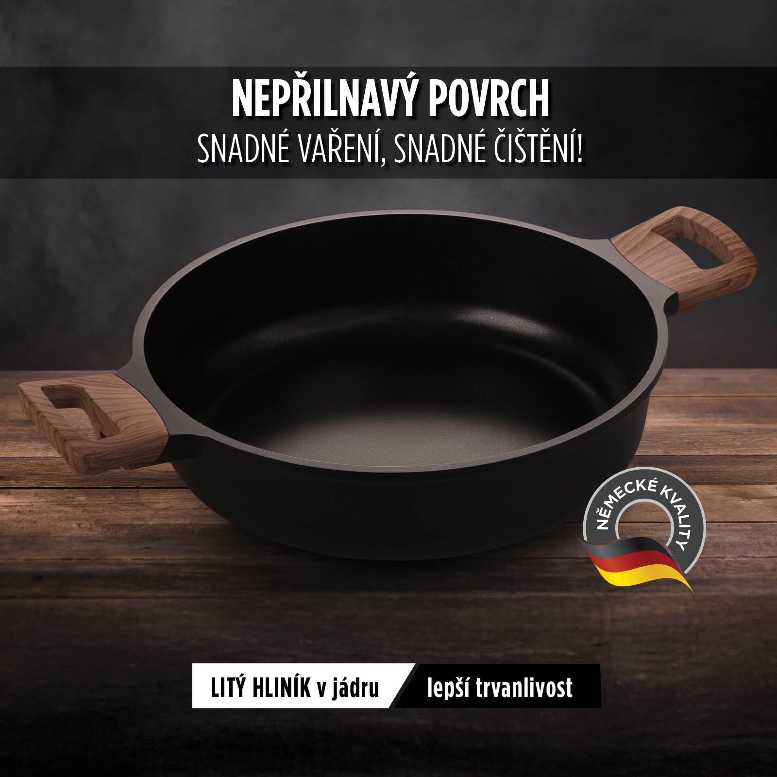- Nízký kastrol o průměru 28 cm z kvalitního litého hliníku.