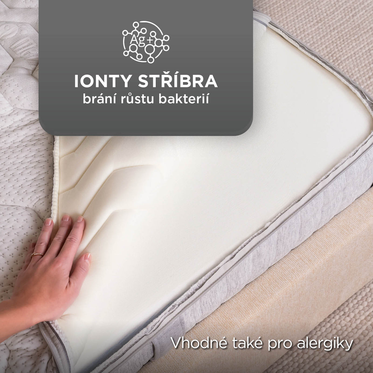 - Stříbrné ionty v potahu pomáhají zmírňovat příznaky alergií a citlivosti pokožky díky antibakteriálnímu účinku.