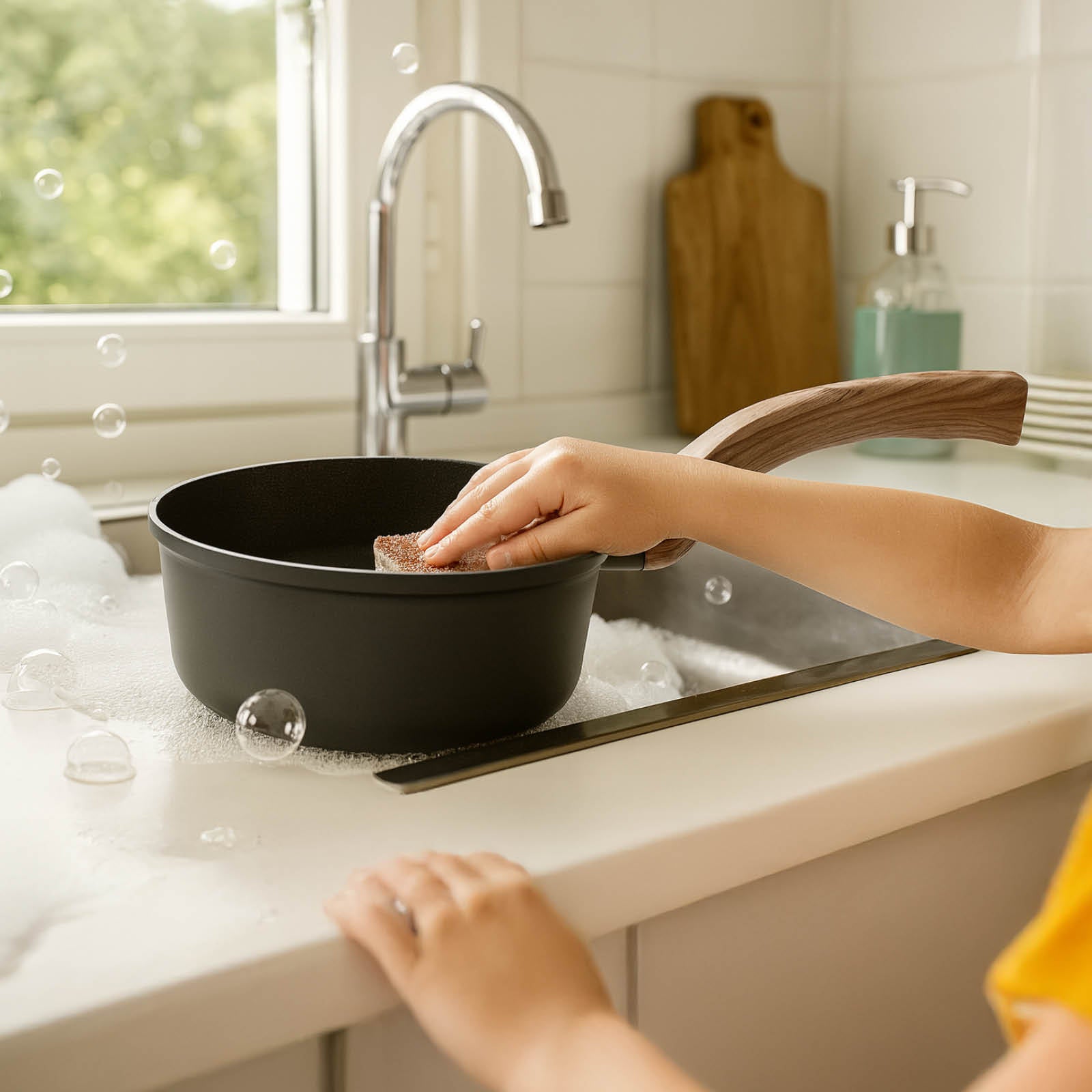 Před prvním použitím umyjte vnitřek nádobí jemnou mýdlovou vodou a před každým použitím jej lehce potřete malým množstvím tuku. Prázdné nádobí nepřehřívejte. Vyhněte se vaření při nejvyšších teplotách. Před mytím nechte nádobí zcela vychladnout. Nádobí nedrhněte ostrými nebo kovovými předměty (např. drátěnkami). Mytí v myčce nádobí je povoleno pouze při nižších teplotách s minimálním množstvím čisticího prostředku. Pro prodloužení životnosti nádobí doporučujeme ruční mytí. Při vaření dbejte na to, aby velikost varné zóny nepřesahovala průměr dna nádobí. U indukce je nutné toto pravidlo přísně dodržovat. S nádobím zacházejte opatrně, aby nedošlo k mechanickému poškození.