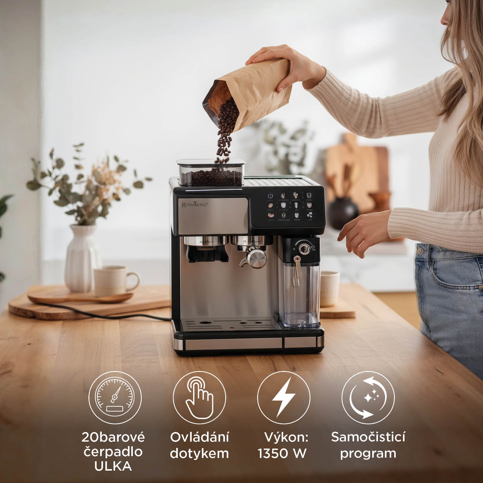 Rosmarino Barista vytváří ten okamžik, kdy se ráno promění v pocit klidu. Za dvě minuty vás přivítá káva, která voní jako z kavárny, ale je připravená přesně podle vaší chuti – bez front, bez slov, jen stisknutím tlačítka.