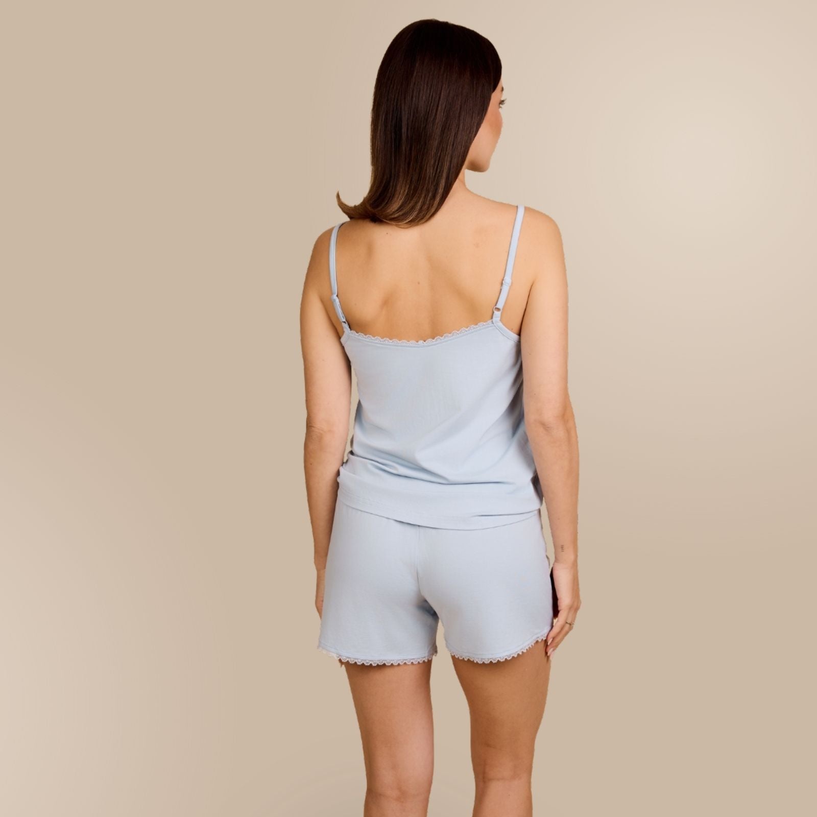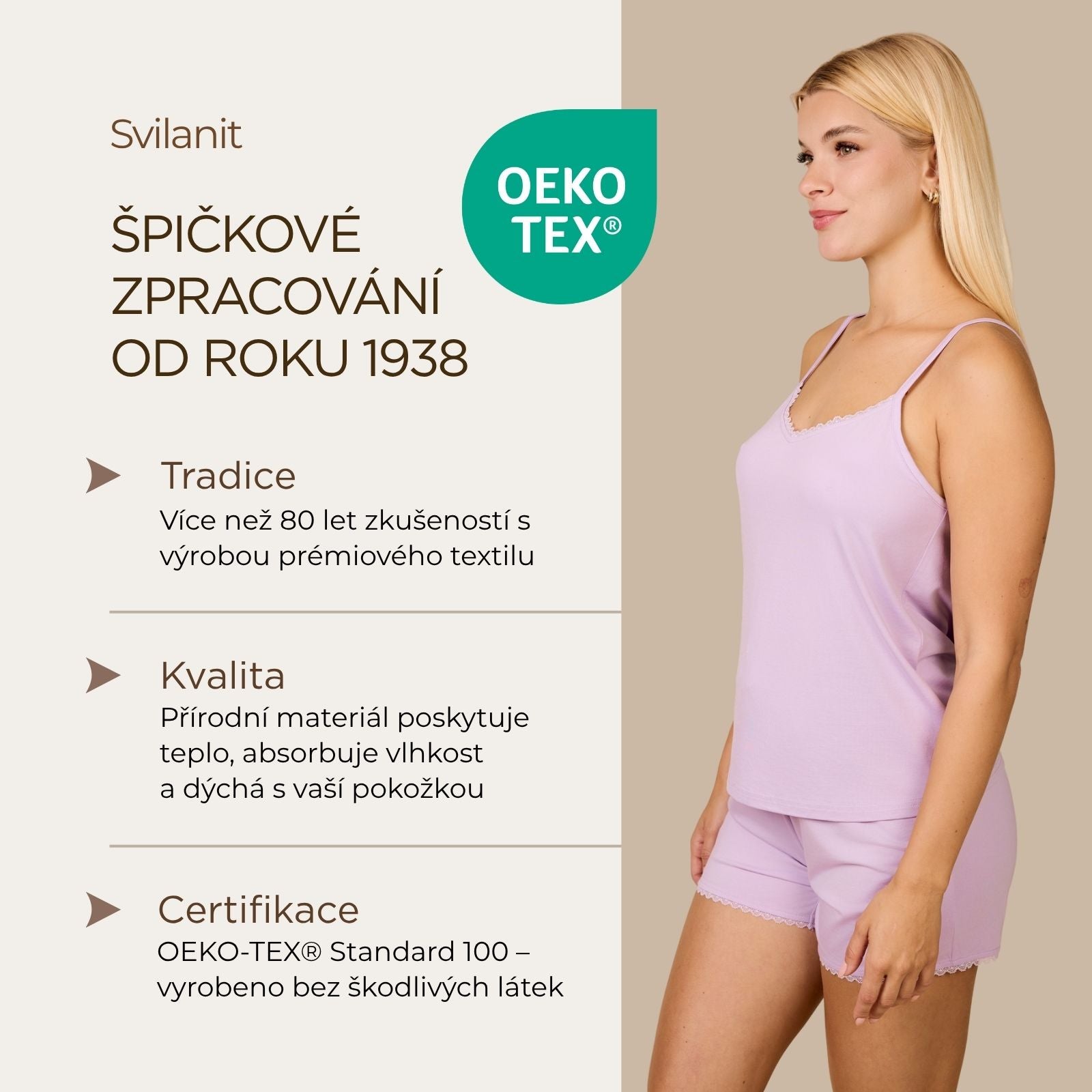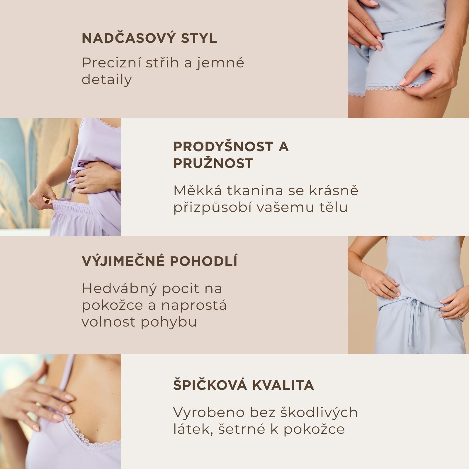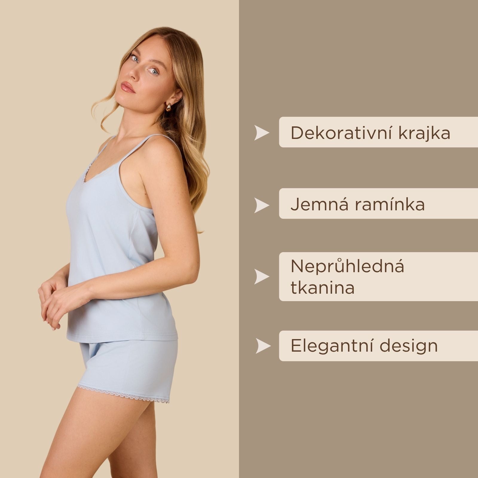 - Jemná ramínka a propracovaná krajka na dekoltu a lemu šortek