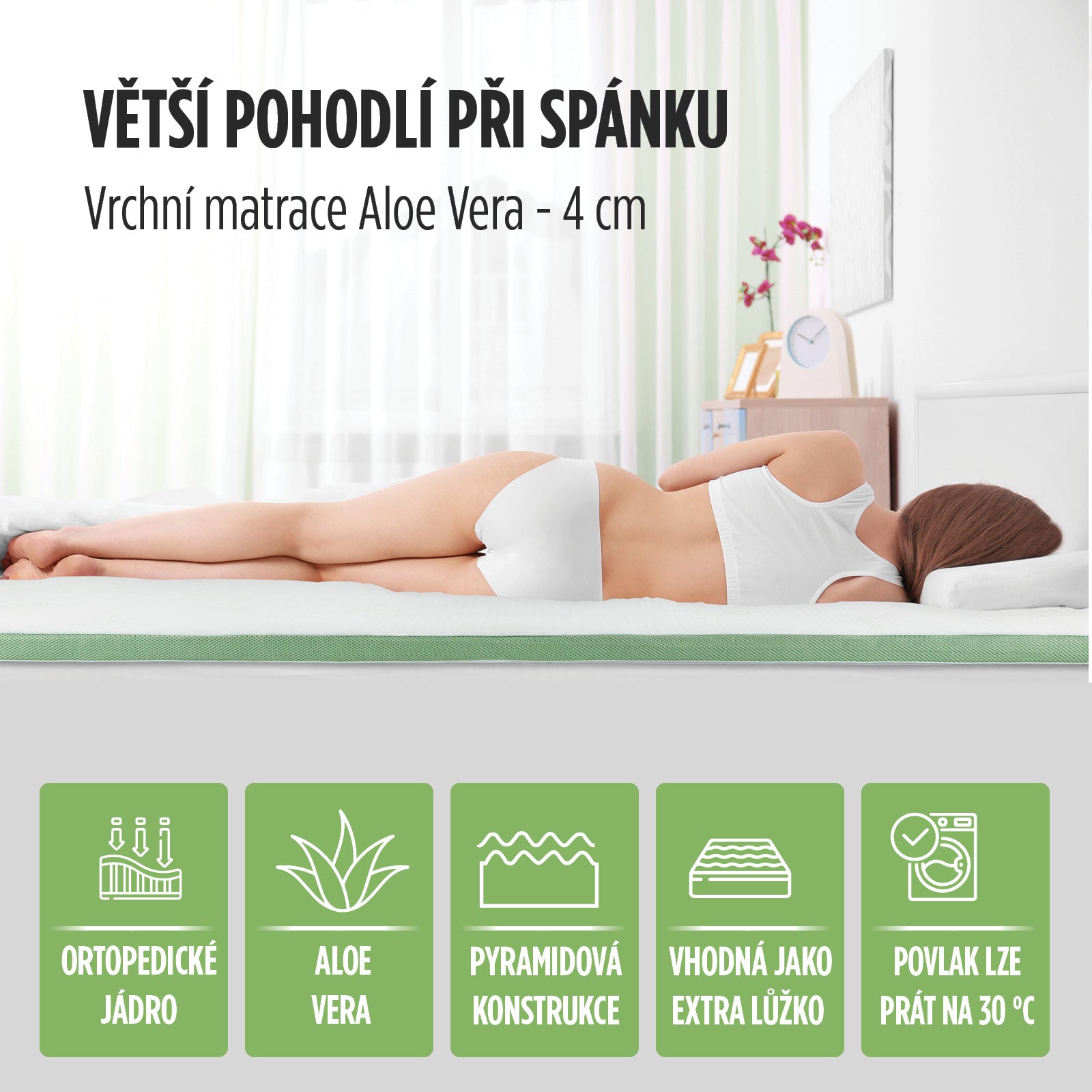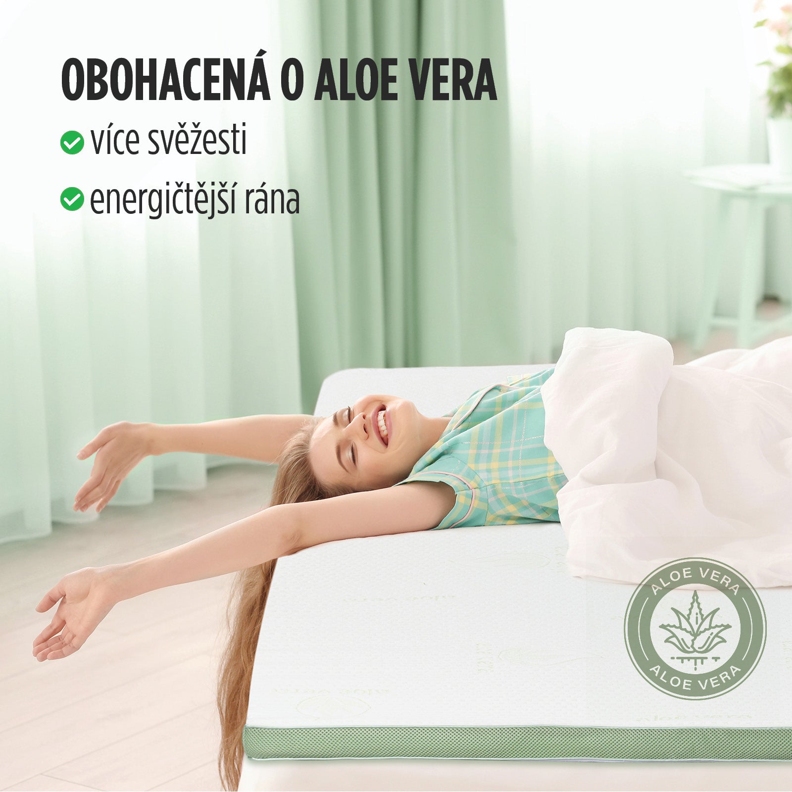 - V potahu vrchní matrace vás zaujme úprava aloe vera. Budete se probouzet odpočatí, vyspalí a jako byste spali s voňavými rostlinami s jemnou vůní aloe vera!