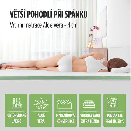 Vrchní matrace z pěny lisované za studena Aloe vera má výšku 4 cm a poskytuje matraci extra pohodlí, prodlužuje její životnost a zajišťuje, že se ráno probudíte odpočatí a vyspalí jako nikdy předtím. Ortopedické jádro z vysoce elastické polyuretanové pěny s pyramidovou strukturou poskytuje bodovou oporu a dokonale se přizpůsobí vašemu tělu. Potah je obohacen o esenci z aloe vera, je snímatelný a pratelný na 30 °C. Užijte si klidný spánek, jako byste spali na tom nejpohodlnějším obláčku!