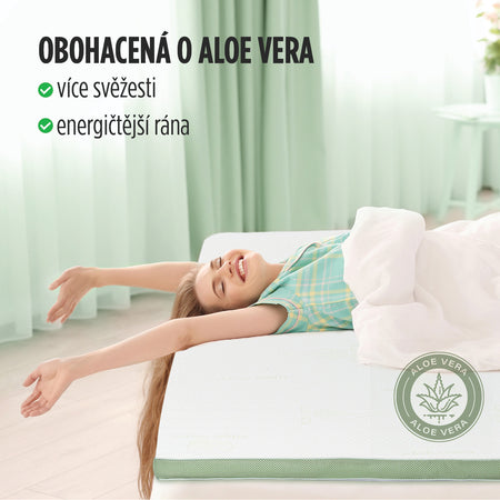 Potah vrchní matrace je obohacen o esenci Aloe Vera, která zajistí extra svěžest a příjemnou vůni. Aloe vera je známá pro své kosmetické účinky a používá se již od starověku. S vrchní matrací Aloe Vera se budete probouzet odpočatí, vyspalí a jako byste spali s voňavými rostlinami s jemnou vůní aloe vera.