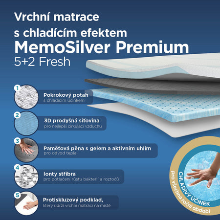 Prémiová vrchní matrace MemoSilver Premium Fresh 5+2 se skládá ze dvou hlavních vrstev: 2 cm paměťové pěny s gelem a aktivním uhlím a 5 cm vysoce kvalitní polyuretanové pěny. Její složení poskytuje optimální oporu páteři, kyčlím a ramenům během spánku a pomáhá předcházet bolesti.