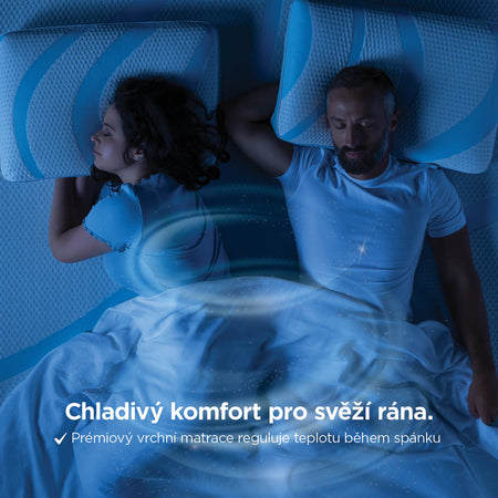 - Prémiová vrchní matrace vyniká chladicím účinkem – reguluje teplotu a odvádí přebytečné teplo pro optimální spánek ve všech ročních obdobích.