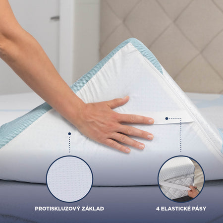 - 4 elastické popruhy a protiskluzová základna zajišťují, že topper zůstane bezpečně na svém místě.